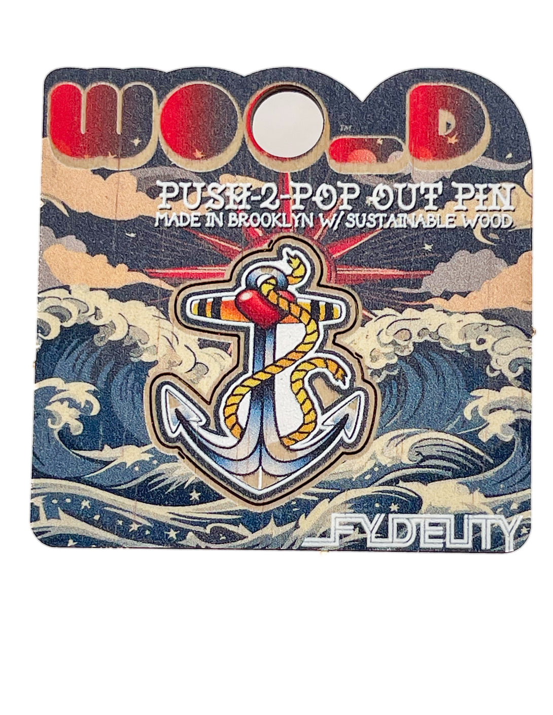 Printed Wood Pin with butterfly backing. Sustainably Made in Brooklyn NYC with 100% Sustainable Wood Grown in the USA. Unique Push-2-Popª Design creates a beautiful zero-packing product.