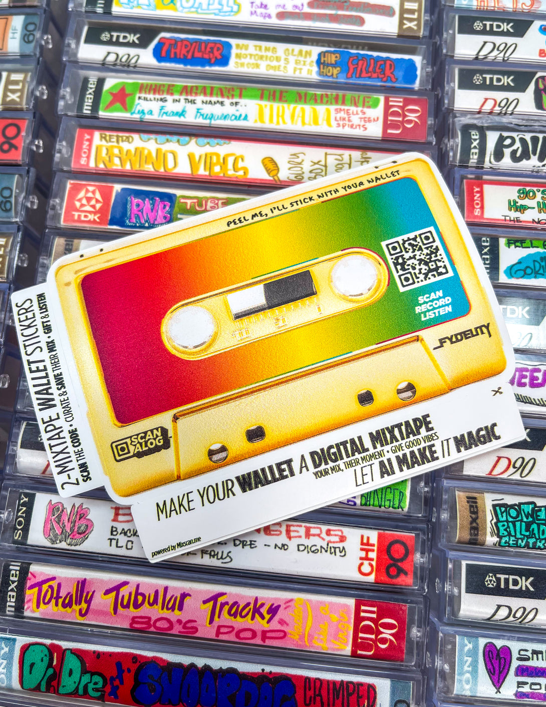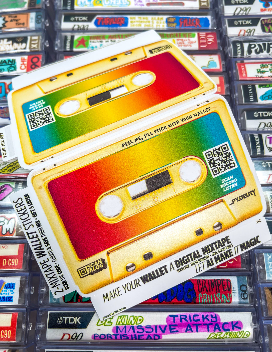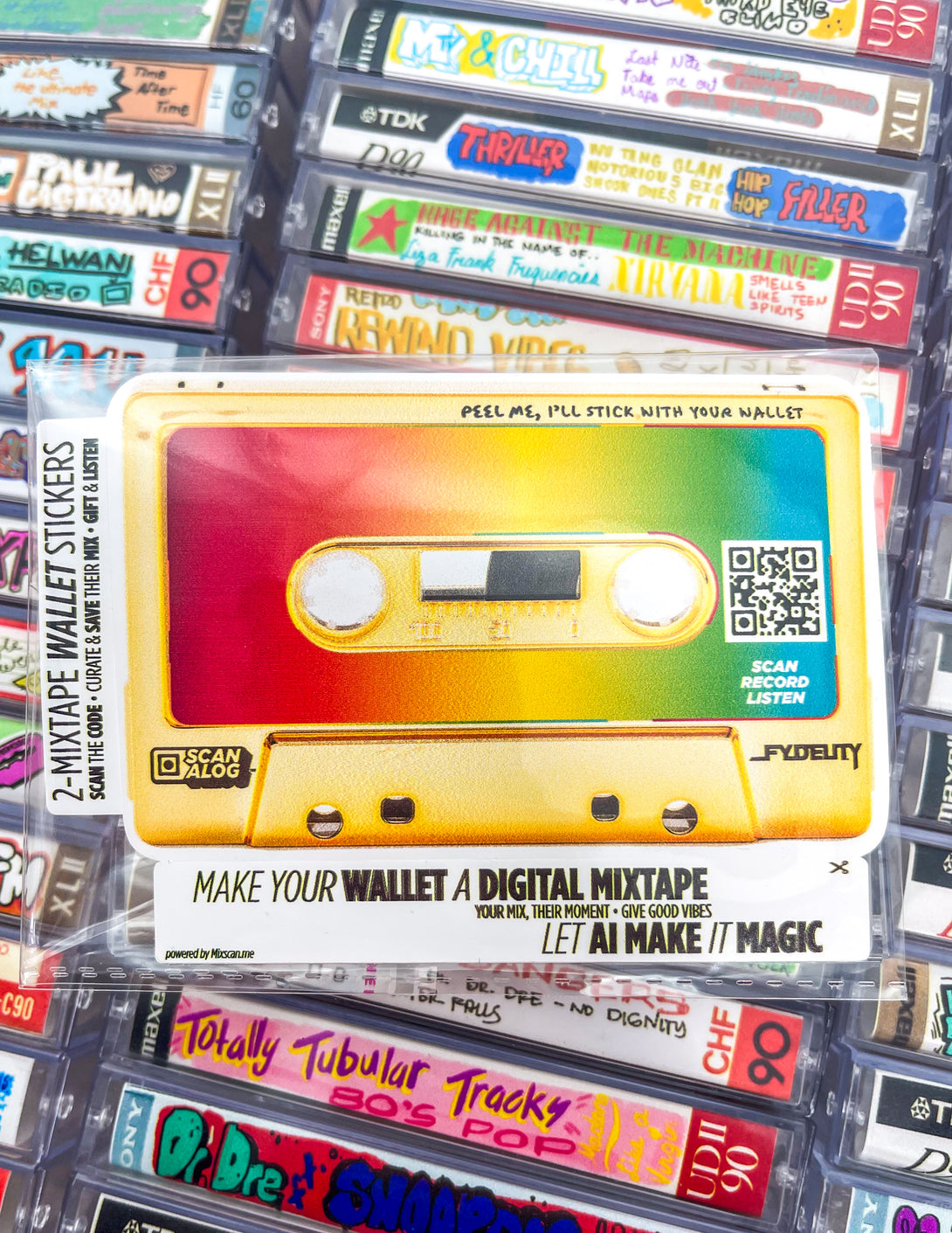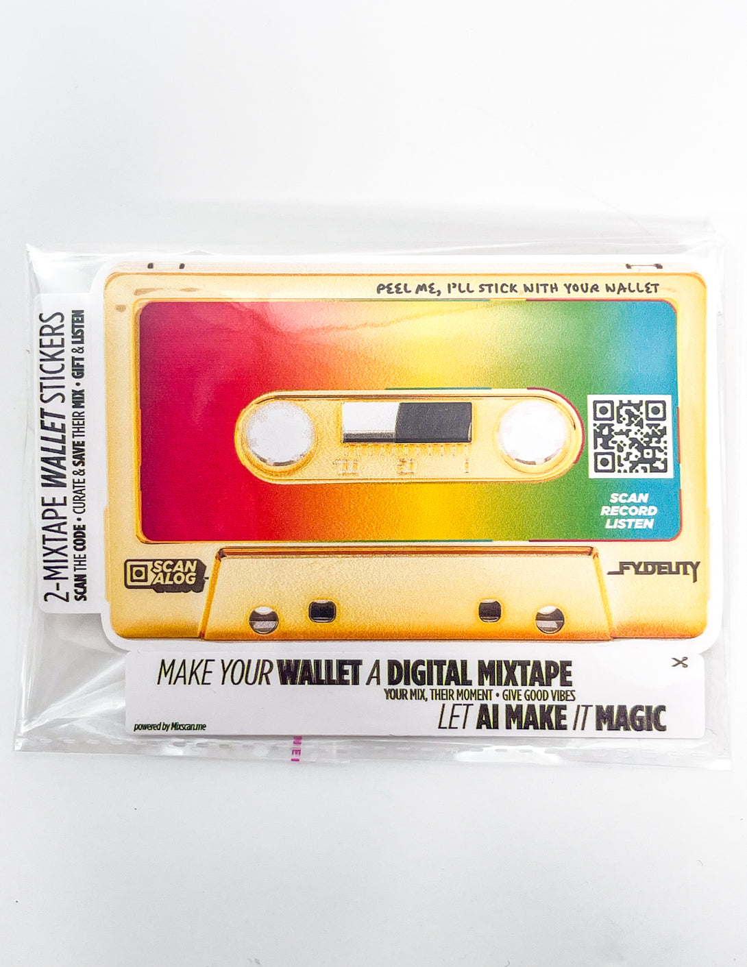 A two-sticker cassette set that flips your Fydelity cassette wallet into a full Digital Mixtape moment. Each decal carries a scannable code that unlocks Mixscan (https://mixscan.me), letting you build an 8-track story, save it with your unique key, and hand someone a vibe they can listen to anytime.
