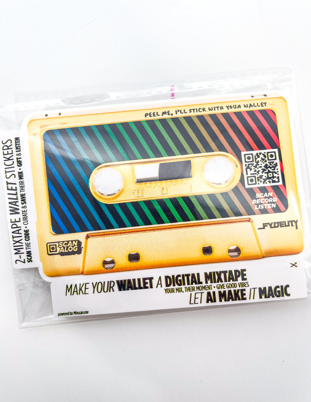A two-sticker cassette set that flips your Fydelity cassette wallet into a full Digital Mixtape moment. Each decal carries a scannable code that unlocks Mixscan (https://mixscan.me), letting you build an 8-track story, save it with your unique key, and hand someone a vibe they can listen to anytime.